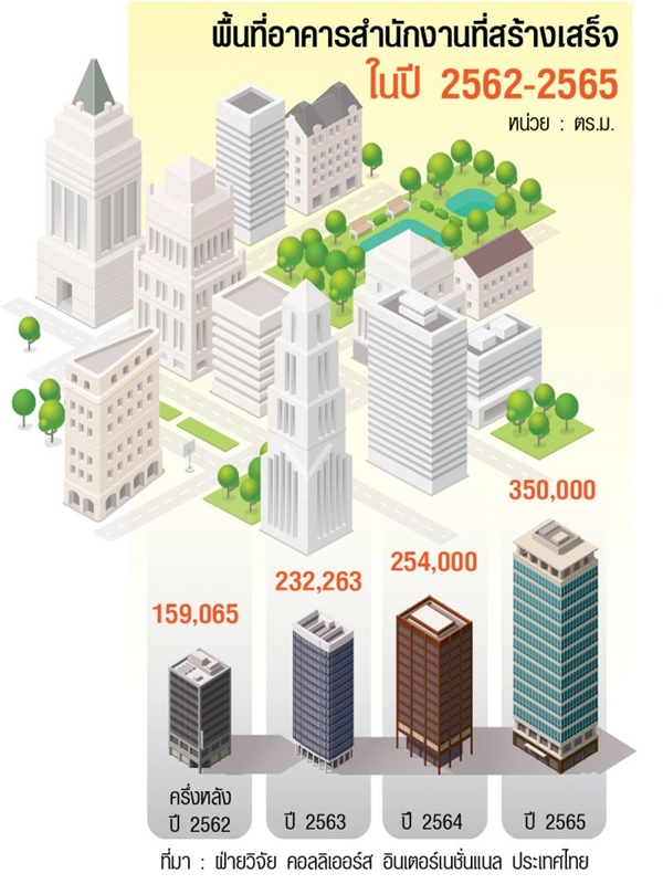 ฝ่ายวิจัย คอลลิเออร์ส อินเตอร์เนชั่นแนล ประเทศไทย รายงานตลาดอาคารสำนักงานในกรุงเทพมหานคร ณ ไตรมาส 2 ปีนี้มีพื้นที่ทั้งสิ้น 8.716 ล้านตารางเมตร ถึงแม้ว่าในช่วงไตรมาสที่ผ่านมาพบว่าไม่มีอาคารสำนักงานใหม่ที่ก่อสร้างแล้วเสร็จและเปิดให้บริการ ซึ่งบางอาคารสำนักงานที่เคยคาดการณ์ว่าจะก่อสร้างแล้วเสร็จในช่วงไตรมาสนี้ แต่ต้องเลื่อนการเปิดตัวออกไป เนื่องจากอยู่ระหว่างการขออนุญาต