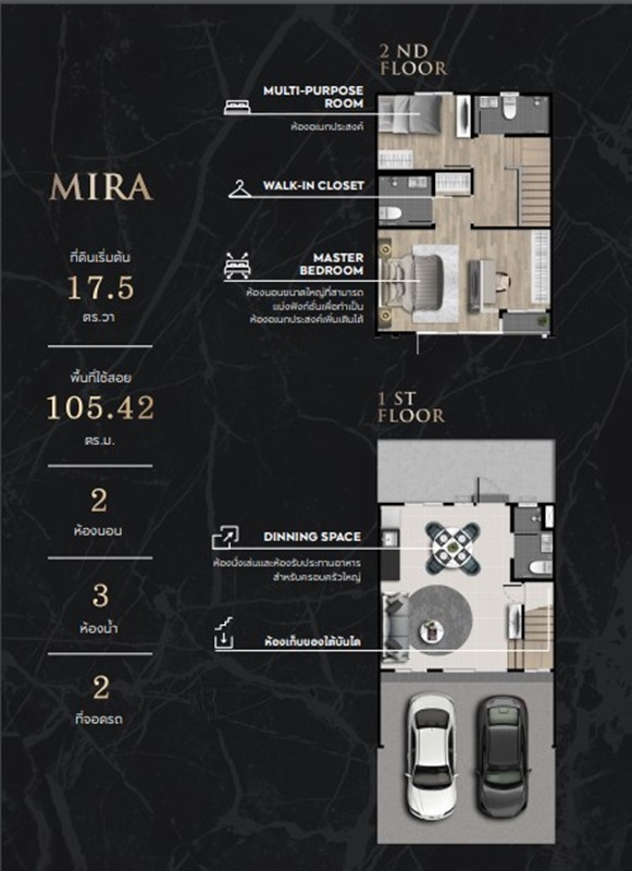 MIRA ทาวน์โฮม 2 ชั้น พื้นที่ใช้สอย 105.42 ตร.ม. หน้ากว้าง 5.5 ม. 2 ห้องนอน 3 ห้องน้ำ 2 ที่จอดรถ ที่ดินเริ่มต้น 17.5 ตร.วา