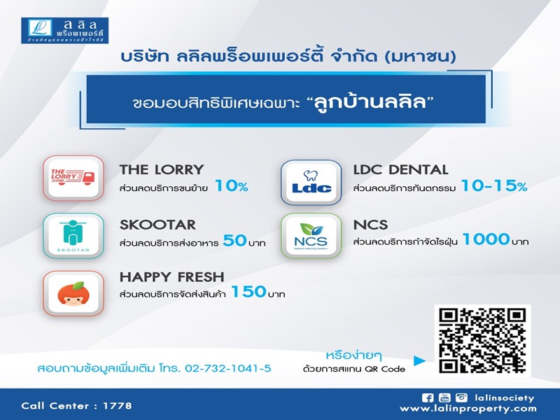 บริษัท ลลิล พร็อพเพอร์ตี้ จำกัด (มหาชน) มอบสิทธิประโยชน์แบบคุ้มสุดคุ้ม เพิ่มความสะดวกในทุกการใช้ชีวิต ผนึกพลัง 5 แบรนด์ดัง The Lorry.com บริการขนย้ายของใช้มืออาชีพ มอบส่วนลดทันที 10%, NCS บริการกำจัดไรฝุ่นมาตรฐานสากล มอบส่วนลดพิเศษ 1,000 บาท, SKOOTAR แมสเซ็นเจอร์มือโปรส่งด่วนทั่วกรุงเทพฯ และปริมณฑล มอบส่วนลดบริการส่งอาหาร 50 บาท, Happy Fresh บริการช่วยช้อปสินค้า ส่งถึงบ้านในชั่วโมงถัดไป มอบส่วนลดบริการจัดส่งสินค้า 150 บาท และคลินิกทันตกรรม Ldc ให้ทุกที่มีแต่รอยยิ้ม มอบส่วนลด 15% สำหรับทันตกรรมทั่วไป และส่วนลด 10% สำหรับทันตกรรมเฉพาะทาง เพียงแสดงบัตร Lalin Privilege Card วันนี้ถึง 31 ธันวาคม 2562