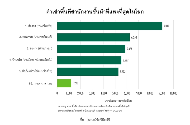 จากรายงานค่าเช่าพื้นที่สำนักงานชั้นนำทั่วโลก (Global Prime Office Occupancy Costs) ฉบับล่าสุดซึ่งจัดทำโดยแผนกวิจัย ซีบีอาร์อี บริษัทที่ปรึกษาด้านอสังหาริมทรัพย์ระดับโลก พบว่า จากการสำรวจอาคารสำนักงานชั้นนำใน 122 เมืองทั่วโลก ค่าเช่าพื้นที่สำนักงานในกรุงเทพมหานครอยู่ในอันดับที่ 86 ของโลก โดยมีค่าเช่าเฉลี่ยของสำนักงานชั้นนำอยู่ที่ 1,208 บาทต่อตารางเมตรต่อเดือน และอยู่ในอันดับที่ 46 ของตลาดอาคารสำนักงานที่มีการเติบโตในด้านค่าเช่าต่อปี