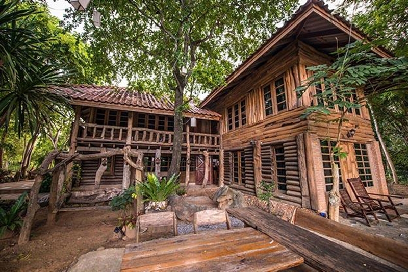 Riverside house, จ. กาญจนบุรี บ้านไม้ทั้งหลังสร้างจากไม้เนื้อแข็งตั้งอยู่ใจกลางธรรมชาติ มีระเบียงไม้ขนาดใหญ่สัมผัสบรรยากาศริมน้ำ