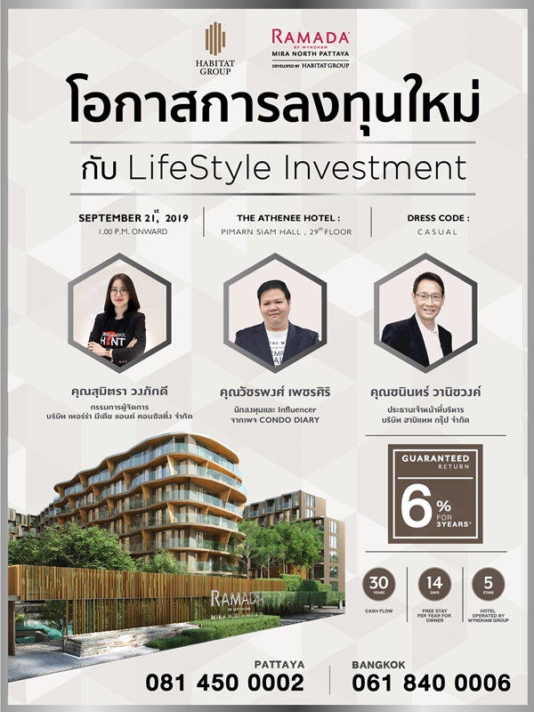 พร้อมแนะนำสุดยอดโครงการเพื่อ Lifestyle Investment คอนโดมิเนียมสไตล์รีสอร์ทหรูระดับ 5 ดาวบนทำเลพัทยาเหนือ Ramada by Wyndham Mira North Pattaya ที่มอบสิทธิพิเศษและผลตอบแทนต่อเนื่องนานถึง 30 ปี การันตีผลตอบแทน ที่ 6% ใน 3 ปีแรก, เข้าพักฟรีกว่า 14 วัน* พร้อมส่วนลดกว่า 200,000 บาท
