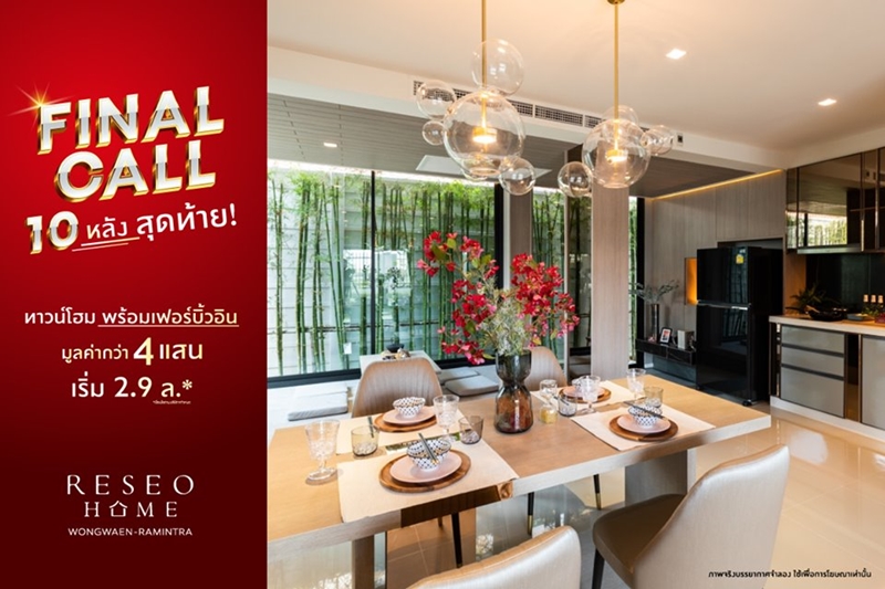 กระแสแรงไม่เลิก เปิดจองกี่รอบก็ยอดจองล้น เรซิโอ-โฮม (วงแหวน-รามอินทรา) ทาวน์โฮม 2 ชั้น ฟังก์ชันบ้านเดี่ยว 4 ห้องนอน ของดีมีน้อย เหลือเพียง 10 ยูนิตสุดท้ายเท่านั้น แจ้งมาจากบริษัท รีโว ซีอาร์ส โฮม จำกัด ผู้พัฒนาโครงการ ล่าสุดเตรียมปิดโครงการ นำบ้าน 10 หลังสุดท้าย มาจัดแคมเปญไฟนอลคอลล์ (Final Call) ในราคาเริ่มต้นเพียง 2.9 ล้านบาท* เฉพาะลูกค้าลงทะเบียนออนไลน์ รับข้อเสนอพิเศษ เฟอร์นิเจอร์บิลท์อินพร้อมส่วนลด มูลค่ารวม 400,000.-* ทันที!