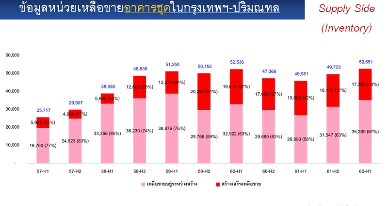 ขณะที่คอนโด ในกรุงเทพฯ และปริมณฑล มีอุปทานคงค้างในช่วงครึ่งปีแรกของปี 2562 มีทั้งสิ้น 52,651 หน่วย แยกเป็นสร้างเสร็จเหลือขาย 17,362 หน่วย สัดส่วน 33% เหลือขายอยู่ระหว่างก่อสร้าง 35,289 หน่วย สัดส่วน 67%