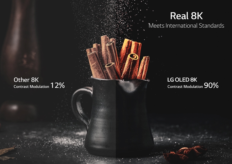 โดยนอกจากจำนวนเม็ดพิกเซลที่ตรงตามมาตรฐานแล้ว ค่า Contrast Modulation (CM) ของทีวี 8K จากแอลจีทั้งสองตระกูลยังสูงถึง 90 เปอร์เซ็นต์ ในขณะที่ทีวี 8K ของคู่แข่งอื่น ๆ มีค่า CM ที่ 12 เปอร์เซ็นต์เท่านั้น ซึ่งหากมีค่า CM สูง ภาพและตัวอักษรที่ปรากฎบนหน้าจอก็จะมีความคมชัดมากขึ้นตามไปด้วย นับเป็นบรรทัดฐานในการตรวจสอบความละเอียดของหน้าจอที่แม่นยำที่สุด จึงสามารถรับประกันภาพสวย สีสันสมจริง ความละเอียดสูงสุดด้วยมาตรฐานที่น่าเชื่อถือในระดับโลก