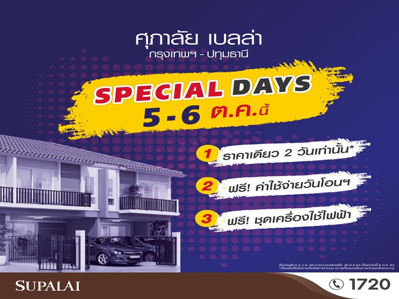 บริษัท ศุภาลัย จำกัด (มหาชน) จัดงาน Special Days พร้อมข้อเสนอพิเศษสุด ๆ สำหรับคนพิเศษเช่นคุณ เริ่ม 1.99 ล้านบาท ในวันเสาร์ที่ 5 และวันอาทิตย์ที่ 6 ตุลาคม 2562 นี้ ณ โครงการศุภาลัย เบลล่า กรุงเทพฯ ปทุมธานี พบกับข้อเสนอสุดพิเศษ คุ้มทั้งราคาและคุณภาพภายในงาน Special Days กับโครงการศุภาลัย เบลล่า กรุงเทพฯ - ปทุมธานี