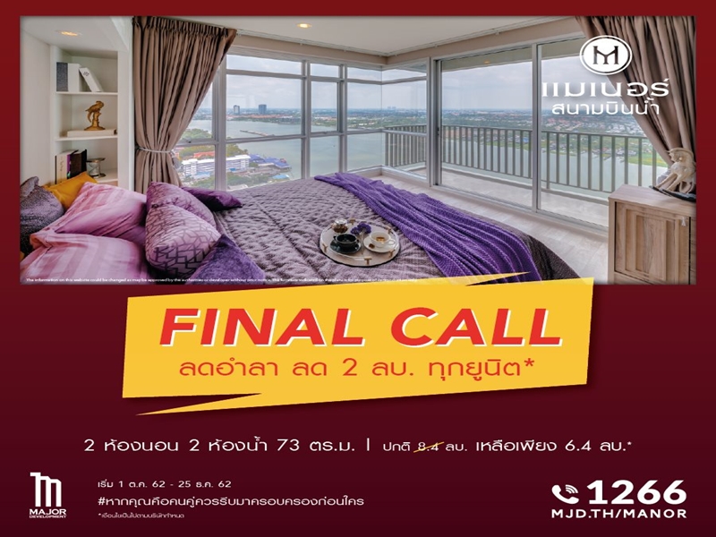 บริษัท เมเจอร์ ดีเวลลอปเม้นท์ จำกัด (มหาชน) จัดโปรฯ หนัก “Final call ลดอำลา” กระตุ้นยอดขาย โค้งสุดท้ายปลายปี ลดมากสุด 2 ล้านบาททุกยูนิต ของราคาห้องชุดโครงการ แมเนอร์ สนามบินน้ำ คอนโดริมแม่น้ำเจ้าพระยา เจาะกลุ่มนักธุรกิจ มองหารีสอร์ทโฮม ทำเลไม่ไกลรถไฟฟ้า ด้วยเส้นทางเชื่อมต่อสะดวกรถไฟฟ้าสายสีม่วงและทางด่วน