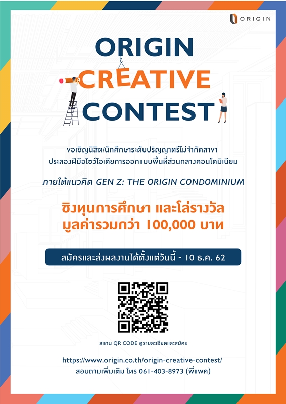 บริษัท ออริจิ้น พร็อพเพอร์ตี้ จำกัด (มหาชน) ขอชวนนิสิต นักศึกษาในระดับปริญญาตรี ร่วมประกวดและส่งผลงานออกแบบพื้นที่ส่วนกลางคอนโดมิเนียมกับโครงการ Origin Creative Contest ชิงเงินรางวัลมูลค่ารวมกว่า 100,000 บาท