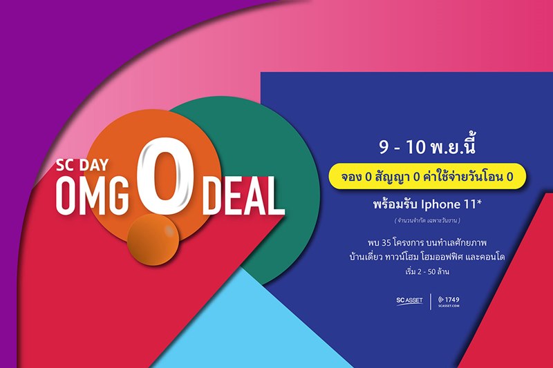 อีกทั้งยังได้จัดแคมเปญใหญ่แห่งปี ! จนต้องร้อง OMG ! ภายใต้ “SC DAY OMG ZERO DEAL” ระหว่าง 9-10 พ.ย. นี้ เพื่อมอบของขวัญส่งท้ายปี ใจดีแจกโปรฯ ครบครัน โดยนำทั้งบ้านเดี่ยว ทาวน์โฮม โฮมออฟฟิศ และคอนโดรวม 34 โครงการคุณภาพ เริ่ม 2-50 ล้านบาท พร้อมข้อเสนอสุดพิเศษ จอง O ทำสัญญา O และ ค่าใช้จ่ายวันโอน O* และ รับ iPhone11**