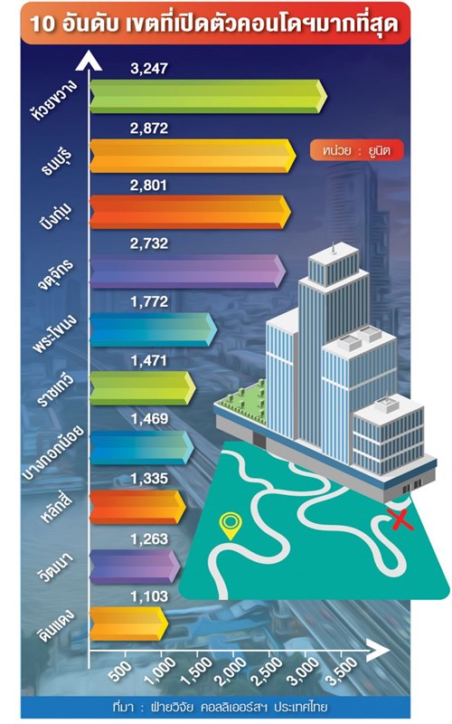 ทั้งนี้ พื้นที่ที่ผู้ประกอบการมีการเปิดตัวโครงการใหม่มากที่สุดในช่วง 9 เดือนแรกของปีนี้ พบว่า เขตห้วยขวาง เป็นเขตที่มีการเปิดขายคอนโดมิเนียมมากที่สุด ประมาณ 3,247 ยูนิต ซึ่งเป็นเขตนักลงทุนชาวจีนเน้นซื้อโครงการที่ตั้งอยู่บนทำเลที่ดี เช่น พระราม 9-รัชดาฯ