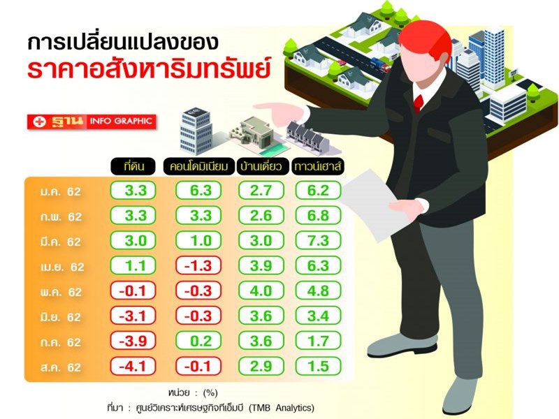 ภาพรวมราคาอสังหาริม ทรัพย์ในช่วง 4 เดือนที่ผ่านมาปรับลดลงอย่างต่อเนื่อง จึงเป็นโอกาสของผู้ที่ต้องการซื้อที่อยู่อาศัย จากผลการสำรวจของศูนย์วิเคราะห์เศรษฐกิจทีเอ็มบี ธนาคารทหารไทย หรือ TMB Analytics พบว่า แม้ว่าราคาบ้านเดี่ยวในกรุงเทพฯและปริมณฑลยังไม่ปรับลดลงมาก ขณะที่ราคาทาวน์เฮาส์แม้ยังไม่ติดลบแต่เริ่มชะลอลง เห็นได้จากต้นปีราคาเติบโต 6.2% จากช่วงเดียวกันของปีก่อนแต่ในเดือนกรกฎาคมราคาปรับลด 1.7% และเดือนสิงหาคมราคาปรับลด 1.5%