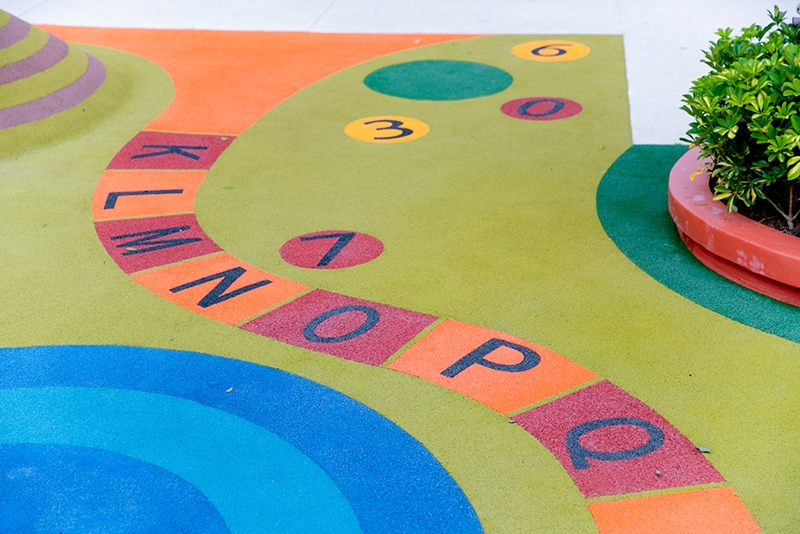 ในส่วนของลวดลายบนพื้นสนาม มีการนำรูปทรงหรือเส้นต่างๆ มาอยู่ร่วมกันในงานออกแบบ อาทิ เส้นโค้ง รูปวงกลม รูปทรงสี่เหลี่ยม-สามเหลี่ยม รูปดาว เพื่อเสริมสร้างการเรียนรู้ และต่อยอดความคิดสร้างสรรค์ได้เป็นอย่างดี รวมถึงองค์ประกอบต่าง ๆ ทั้งการสร้างตาราง ที่มีตัวเลข 0-9 หรือตัวอักษรภาษาอังกฤษ A-Z การออกแบบเนินสำหรับปีนป่าย (คล้ายการปีนเขา) สไลเดอร์ อุโมงค์ลอด ซึ่งนอกจากจะเพิ่มดีกรีความสนุกสนานแล้ว ยังเป็นการฝึกทักษะและพัฒนาการทางร่างกาย อาทิ การทรงตัว การบริหารกล้ามเนื้อแขนและขา และฝึกการใช้ไหวพริบไปในตัวอีกด้วย