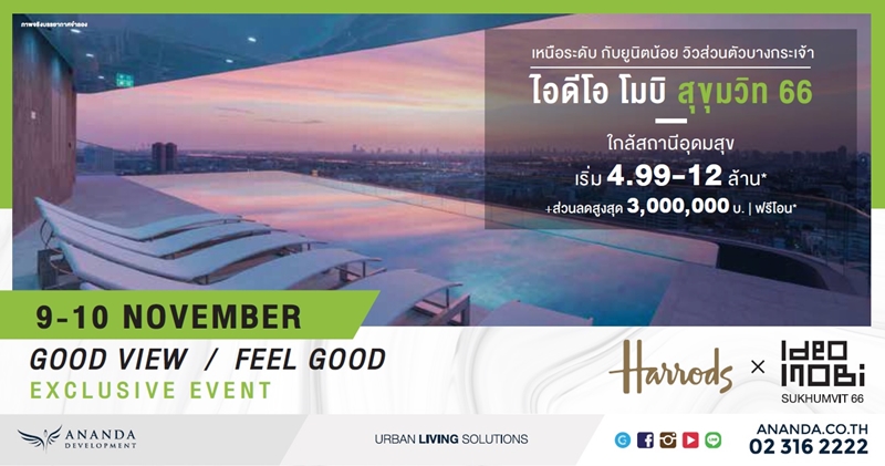 เริ่มกันที่ไอดีโอ โมบิ สุขุมวิท 66 เรามีนัดดื่มชารสดีกับ Harrods พร้อมชมวิวบางกระเจ้า บน Sky Lounge ชั้น 28 ในงาน Good View / Feel Good Exclusive Event โครงการไอดีโอ โมบิ 66 พร้อมของว่างและบริการระดับพรีเมี่ยม พร้อมส่วนลดพิเศษสูงสุด 3,000,000 บาท* สำหรับผู้ที่จอง+ทำสัญญาในงาน โทร 02-316-2222 ลงทะเบียนเพื่อรับส่วนลดก่อนใคร ที่ http://bit.ly/IdeoMobiSukhumvit66