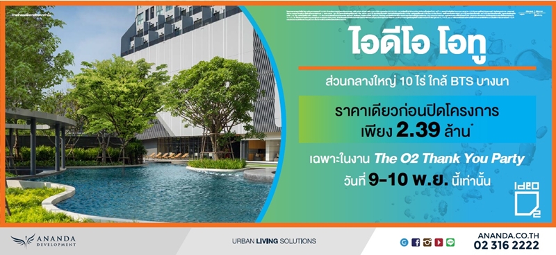 ส่วนไอดีโอ โอทู ก็ไม่ยอมน้อยหน้า จัดปาร์ตี้ The O2 The Thank You Party พร้อมเสิร์ฟให้ลูกค้าทุกท่าน รวมของอร่อย ร้านเด็ด ร้านดัง ย่านบางนา ในบรรยากาศปาร์ตี้ริมสระว่ายน้ำ เป็นครั้งแรก พร้อมร่วมสนุกกิจกรรม DIY บนพื้นที่ส่วนกลางกว่า 10 ไร่ พิเศษ!! เปิดราคาก่อนปิดโครงการ 2.39-3.99 ล้านเท่านั้น โทร 02-316-2222 ลงทะเบียนเพื่อรับส่วนลดได้เลย ที่ https://bit.ly/2LlSm3g