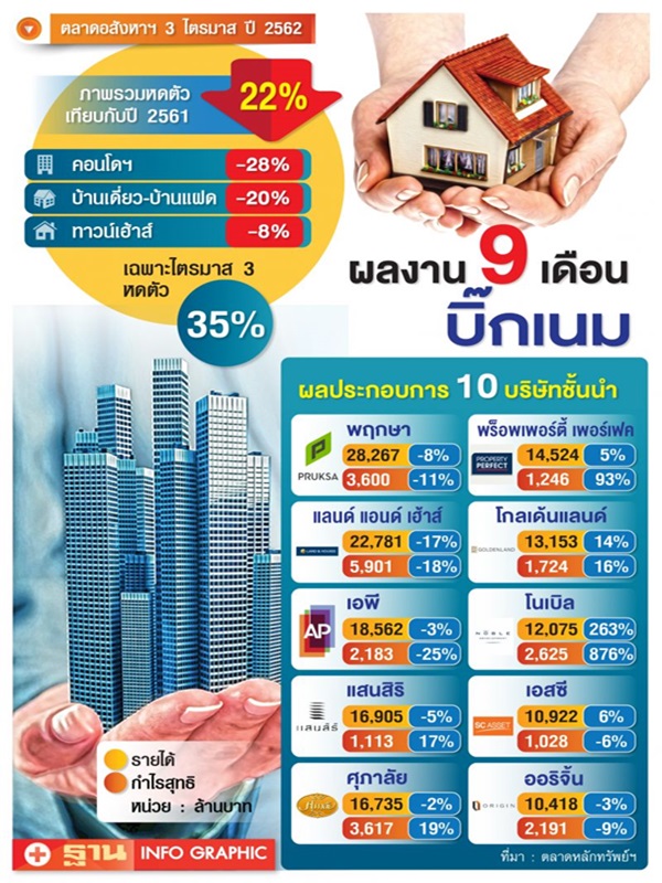 เมื่อพิจารณาผลประกอบการของบริษัทอสังหาฯในตลาดหลักทรัพย์ฯ ช่วง 9 เดือนที่ผ่านมา ซึ่งรายงานกันเกือบครบ พบว่าผู้ประกอบการที่มีรายได้และผลกำไรสูงสุด 10 รายแรก เป็นบิ๊กเนมระดับหัวแถวของตลาด แต่ส่วนใหญ่ คือ 5-6 ราย มีรายได้และกำไรสุทธิที่เติบโตลดลงจากปีก่อน และที่เหลือ 4 รายมีผลประกอบการที่เติบโตเป็นบวกทั้ง 2 ขา