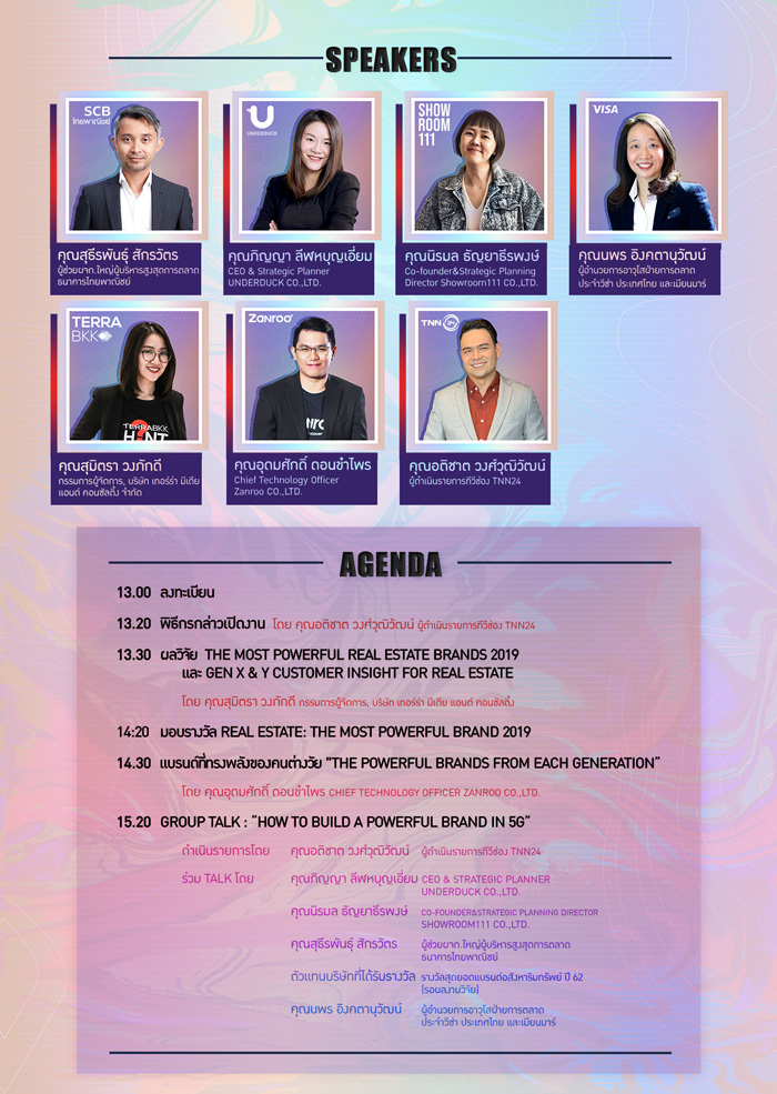 ที่มีผลต่อการสร้าง แบรนด์และพฤติกรรมการซื้ออสังหาริมทรัพย์ ซึ่งเป็นข้อมูลสำคัญที่มีผลกับการวางกลยุทธ์ธุรกิจให้เติบโตและอยู่รอดได้ภายใต้การเปลี่ยนแปลงในยุคปัจจุบัน จากกูรูในวงการสร้างแบรนด์ที่พร้อมจะแชร์ข้อมูลเชิงลึก อาทิ