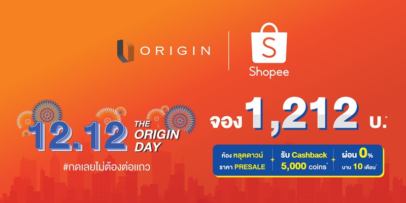 ดิ ออริจิ้น (The Origin) คอนโดเพื่อคนรุ่นใหม่ นำโดย รัฐพล เตชะเลิศสิริมงคล (ซ้าย) ผู้อำนวยการอาวุโส ฝ่ายการตลาดองค์กร บริษัท ออริจิ้น พร็อพเพอร์ตี้ จำกัด (มหาชน) จับมือ Shopee (ช้อปปี้) ผู้นำแพลทฟอร์มอีคอมเมิร์ซในภูมิภาคเอเชียตะวันออกเฉียงใต้และไต้หวันนำโดย สุชญา ปาลีวงศ์ (ขวา) ผู้จัดการฝ่ายการตลาด ช้อปปี้ (ประเทศไทย) เปิดตัวแคมเปญ THE ORIGIN DAY 12.12 ซูเปอร์เซลล์คอนโดมิเนียมหลุดดาวน์ครั้งใหญ่ ด้วยเงินจองเพียง 1,212 บาท ผ่านแอปพลิเคชั่น Shopee เพียงปลายนิ้วก็สามารถเป็นเจ้าของคอนโดฯ ใหม่มาแรงแห่งปี! ทั้ง 6 โครงการใกล้รถไฟฟ้าได้ง่าย ๆ ในราคาพรีเซล