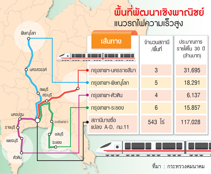 สำหรับการพัฒนาพื้นที่เชิงพาณิชย์ตามแนวรถไฟความเร็วสูงทั้ง 4 เส้นทาง ได้แก่ เส้นทางกรุงเทพฯ-นครราชสีมา คัดเลือกไว้ 3 สถานี คือ สถานีสระบุรี พื้นที่ภายในอาคารสถานี 1,200 ตร.ม. พื้นที่บริเวณย่านสถานี 141 ไร่ พื้นที่ใกล้เคียงที่พัฒนาได้ 97 ไร่ สถานีปากช่อง พื้นที่อาคาร 1,200 ตร.ม. พื้นที่ย่านสถานี 396 ไร่ พื้นที่ใกล้เคียง(พื้นที่ทหารบก(ทบ.) 541 ไร่ สถานีนครราชสีมา พื้นที่ในอาคาร 1,400 ตร.ม. พื้นที่ย่านสถานี 63.94 ไร่ เส้นทางกรุงเทพฯ-พิษณุโลก คัดเลือกไว้ 5 สถานี คือ สถานีอยุธยา พื้นที่ในอาคาร 450 ตร.ม. พื้นที่ย่านสถานี 2.21 ไร่ สถานีลพบุรี พื้นที่ในอาคาร 450 ตร.ม. พื้นที่ย่านสถานี 50 ไร่ พื้นที่ใกล้เคียง(ของทบ.) 2,589 ไร่ สถานีนครสวรรค์ พื้นที่ในอาคาร 900 ตรม. พื้นที่ย่านสถานี 7.74 ไร่ พื้นที่ใกล้เคียง(ของทบ.) 6,120 ไร่ และของสำนักงานตำรวจแห่งชาติ(สตช.) 3,385 ไร่ สถานีพิจิตร พื้นที่ในอาคาร 450 ตร.ม. พื้นที่ย่านสถานี 50 ไร่ พื้นที่ใกล้เคียง(กรมชลประทาน) 165 ไร่ และสถานีพิษณุโลก ภายในสถานี 900 ตร.ม. พื้นที่ย่านสถานี 10.39 ไร่ และพื้นที่ใกล้เคียง(ของทหารอากาศ) 9,323 ไร่