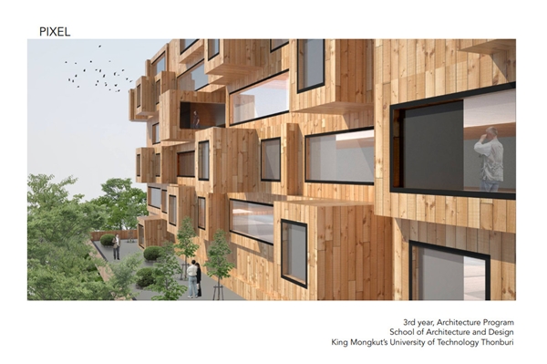 ขณะที่ ปภัส เกื้อสิริกุล กับผลงาน Pixel จุดเด่นคือฟังก์ชั่นของห้องที่ตอบโจทย์ไลฟ์สไตล์ของคนได้หลากหลาย ปฏิวัติรูปแบบคอนโดที่เปิดไปแล้วต้องเจอกับห้องรับแขก ให้กลายเป็นฟังก์ชั่นที่หลากหลายให้เลือก โดยปภัส แบ่งพื้นที่ใช้งานหลักๆ เป็น 3 ส่วนคือ ห้องนอน ห้องนั่งเล่น และห้องครัว หากเป็นครอบครัวมีลูกมักจะอยากเปิดไปเจอกับห้องครัวเพื่อวางของและอาหาร หากเป็นคนทำงานกลับดึกคงเปิดประตูไปเจอห้องนอนก่อน เหล่านี้ปภัส ก็ตอบโจทย์ได้ดีโดยมีรูปแบบห้องที่จับเอา 3 พิกเซล มาเรียงสลับกันตามไลฟ์สไตล์ของผู้อาศัย ในขณะที่เขาก็เลือกให้ภายในห้องมีการทำพื้นเล่นระดับในแต่ละพิกเซลเกิดเป็นความแปลกใหม่ที่ไม่เคยเห็นที่ไหนมาก่อน