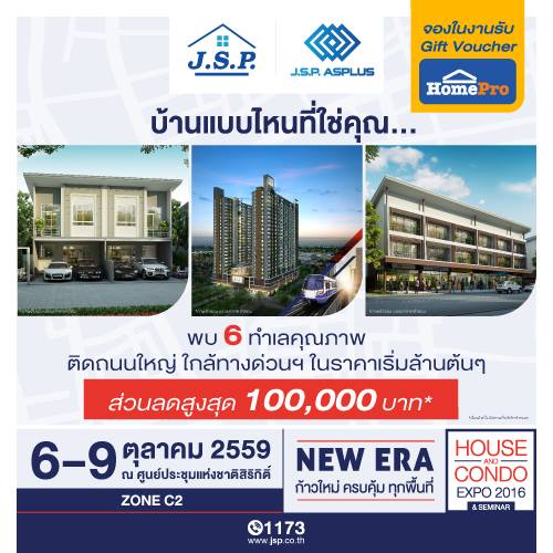 เจ.เอส.พี. ขน 11 โครงการกับ 6 ทำเลคุณภาพ ร่วมออกบูธงานมหกรรมบ้านฯ ครั้งที่ 35 พร้อมส่งโปรโมชั่นสุดพิเศษ Gift Voucher Homepro มูลค่ากว่า 10,000 บาท มอบฟรีสำหรับลูกค้าที่จองภายในงาน โดยโครงการที่นำมาออกบูธ ได้แก่ โครงการสำเพ็ง 2, โครงการไมอามี่ คอนโด บางปู, โครงการทิวลิป สแควร์, โครงการJcondo สาทร - กัลปพฤกษ์, โครงการJ villa สุขุมวิท - แพรกษา, โครงการ JSP city บางปะกง – บ้านโพธิ์, โครงการ JSP city รังสิต คลอง 1 พร้อมพบกับโครงการน้องใหม่แกะกล่อง 4 โครงการ ได้แก่ โครงการJ condo พระราม 2, โครงการJ city ติวานนท์-บางกระดี ,โครงการJ Grand สาทร – กัลปพฤกษ์, และโครงการJ city รัตนธิเบศร์-บางบัวทอง โดยลูกค้าสามารถมาลงทะเบียนจองสิทธิ์ในบูทเพื่อรับราคาพรีเซลพิเศษก่อนใคร!และขบวนส่วนลดอีกมากมายที่ผู้กำลังมองหาซื้อบ้านและคอนโดพลาดไม่ได้!! พบกับโครงการดี สุดคุ้ม ของเจ.เอส.พี. ได้ในงานมหกรรมบ้านและคอนโดฯ ครั้งที่35 ระหว่างวันที่ 6-9 ตุลาคม 2559 ตั้งแต่เวลา 10.00 – 20.00 น. ที่บูธJ.S.P. โซน C2 บูธเลขที่ C200 – C203 ณ ศูนย์การประชุมแห่งชาติสิริกิติ์
