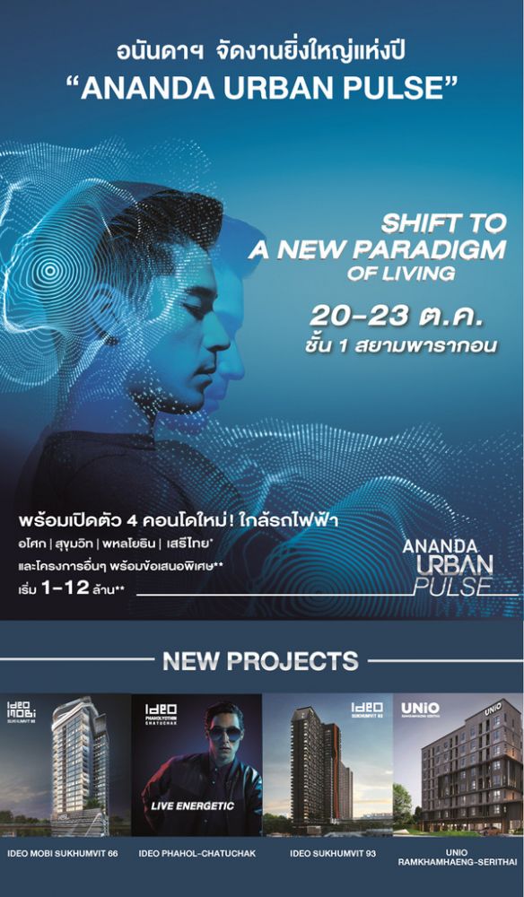 บริษัท อนันดา ดีเวลลอปเม้นท์ จำกัด (มหาชน) เตรียมจัดกิจกรรมการตลาดเพื่อกระตุ้นกำลังซื้อในช่วงครึ่งปีหลัง ด้วยการจัดงาน “ANANDA URBAN PULSE” ส่งโครงการคอนโดมิเนียมคุณภาพเยี่ยมติดรถไฟฟ้าที่คัดสรรมาเป็นอย่างดี กว่า 14 โครงการทั่วกรุงเทพฯ สำหรับไฮไลท์ของงานนี้คือการเปิดตัว 4 โครงการใหม่ล่าสุด พร้อมด้วยโปรโมชั่นพิเศษสุดมากมาย พิเศษสุดเมื่อจองห้องชุดภายในงานรับ Samsung Gear Fit 2 (เฉพาะโครงการที่กำหนด) หรือแค่เพียงร่วมงานก็มีสิทธิ์ลุ้นรับ Siam Paragon Gift Card มูลค่า 5,000 บาท จำนวน 20 รางวัลต่อวัน เปิดโอกาสให้ลูกค้าผู้ต้องการซื้อที่อยู่อาศัยที่มีคุณภาพบนทำเลศักยภาพสูงติดสถานีรถไฟฟ้าของอนันดาฯ สามารถเลือกชมโครงการต่างๆได้อย่างใกล้ชิดก่อนใครพร้อมข้อเสนอสุดพิเศษเมื่อจองซื้อภายในงาน ระหว่างวันที่ 20-23 ตุลาคม 2559 ณ ชั้น 1 ศูนย์การค้าสยามพารากอน
