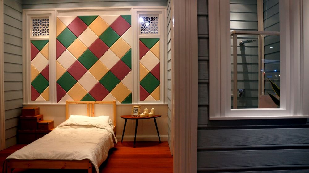 นอกจากเทคนิดในการป้องกันและดูดซับเสียงรบกวนแล้ว เพื่อความสวยงามของห้องต่างๆ ภายในบ้าน “เอสซีจี” ขอแนะนำเคล็ดลับมิกซ์แอนด์แมทช์ 3 ห้องสำคัญของบ้าน ให้สวยมีดีไซน์ ไร้เสียงรบกวน เริ่มด้วยห้องแรก ห้องนอน ห้องที่ต้องการความสงบ เพื่อการพักผ่อนอย่างเต็มที่ จึงควรติดตั้งฉนวนป้องกันเสียงในโครงคร่าวที่บริเวณผนังด้านที่ติดกับห้องข้างๆ เพื่อป้องกันเสียงจากภายนอกเข้ามารบกวน และติดตั้งฉนวนดูดซับเสียงผนังบริเวณหัวนอนซึ่งเป็นจุดตรงข้ามกับแหล่งกำเนิดเสียง เพื่อลดเสียงสะท้อน และเป็นการเพิ่มจุดสนใจให้กับห้อง โดยอาจใช้ฉนวนรูปสี่เหลี่ยมจัตุรัส จัดเรียงสลับสีกันจนเกิดเป็นลวดลายมีดีไซน์ โทนสีที่เหมาะกับห้องนอนควรเป็นสีอ่อนที่ให้ความรู้สึกผ่อนคลาย เช่น สีขาว ครีม น้ำตาลอ่อน และอาจจะแซมสีที่ดูหวานแต่ยังอยู่ในโทนเย็น เช่น สีชมพู เขียวอ่อน เป็นต้น