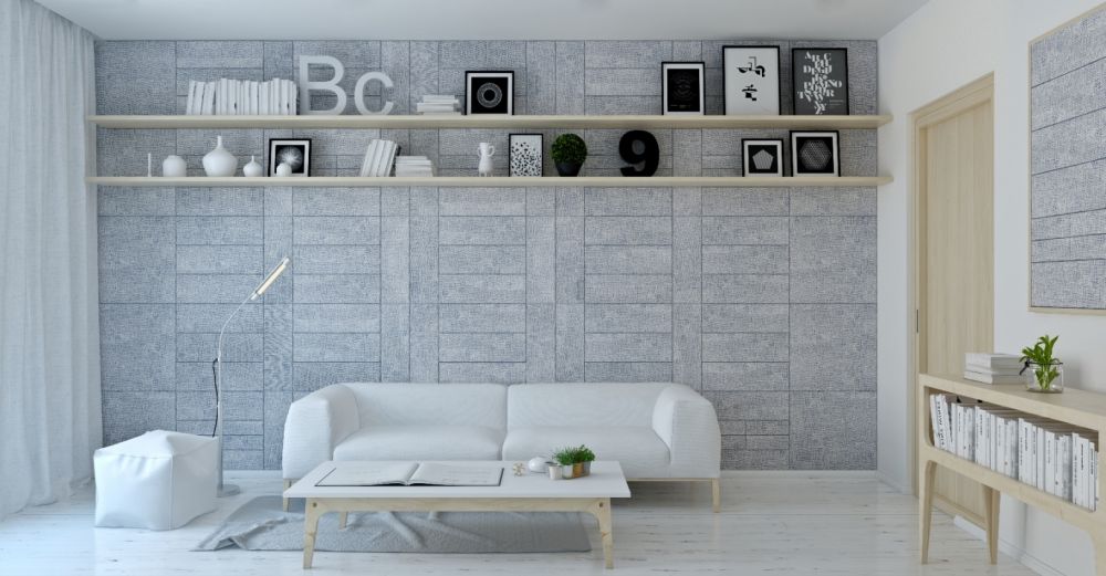 ถัดมา ห้องนั่งเล่น เนื่องจากเป็นห้องที่มีปริมาณการใช้เสียงสูงกว่าห้องนอน เพราะมักเป็นห้องศูนย์รวมของสมาชิกภายในบ้าน เพื่อใช้ทำกิจกรรมยามว่างร่วมกัน อย่างดูทีวี ฟังเพลง หรือจัดกิจกรรมที่ส่งเสียงดัง จึงแนะนำ ให้ติดตั้งฉนวนป้องกันเสียงในโครงคร่าวเพื่อป้องกันเสียงรบกวนจากนั้นติดตั้งฉนวนดูดซับเสียงประมาณ 35% ของพื้นที่ผนังทั้ง 4 ด้าน เพื่อลดเสียงสะท้อนและดูดซับเสียงภายในห้องไม่ให้ออกไปรบกวนภายนอก สำหรับโทนสีที่เหมาะควรคำนึงถึงสไตล์ของห้องและเฟอร์นิเจอร์ที่ใช้ อาจเน้นให้เลือกสีที่ดูสบายตา อบอุ่น หากต้องการใช้มากกว่า 2 สี ควรคุมโทนสีให้มีความใกล้เคียงกัน เช่น สีเบจ สีขาว ครีม หรือ ดำ น้ำตาล เทา เป็นต้น รูปแบบการจัดเรียงอาจใช้แผ่นสีเหลี่ยมผืนผ้าขนาดเล็กเรียงสลับกับขนาดใหญ่ สร้างสรรค์ให้ผนังดูมีดีไซน์