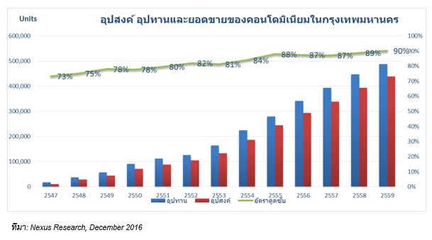 ดีมานด์ใหม่ มากกว่า อุปทานใหม่ และอัตราการขายรวมของคอนโดมิเนียมตลาดเพิ่มขึ้นเป็น 90% (ยอดขายรวมของคอนโดมิเนียมสะสมอยู่ที่ 438,000 หน่วย) ในปี 2559 คอนโดมิเนียมที่เปิดใหม่ในตลาดมียอดขายเฉลี่ยอยู่ที่ 64% ทั้งนี้ทำเลที่มียอดขายสูงสุด 3 ทำเลคือ 1. พระโขนง สวนหลวง 2.พญาไท รัชดาภิเษก 3. งามวงศ์วาน ติวานนท์