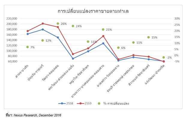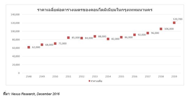 ในปี 2559 ราคาขายเฉลี่ยของคอนโดมิเนียมในกรุงเทพฯ ยังปรับตัวสูงขึ้นอย่างต่อเนื่อง โดยปรับตัวสูงขึ้นถึง 14% จาก 106,000 บาทต่อตารางเมตร ปรับขึ้นเป็น 121,000 บาทต่อตารางเมตร ในช่วงปีที่ผ่านมา ซึ่งอัตราการเพิ่มขึ้นนี้ สูงกว่าอัตราเฉลี่ยราคาคอนโดมิเนียมในช่วง 5 ปีที่ผ่านมา ที่เพิ่มขึ้น 8% ต่อปีค่อนข้างมาก โดยเฉพาะอย่างยิ่งตลาดคอนโดมิเนียมกลางเมืองราคาปรับตัวสูงขึ้นถึง 15% โดยโครงการใหม่ที่เปิดในใจกลางเมืองปีนี้ราคาสูงกว่า 150,000 บาทต่อตารางเมตรทุกโครงการ ปัจจัยหลักก็ยังคงเนื่องมาจาก ราคาต้นทุนที่ดินที่เพิ่มสูงขึ้นในทุกๆ ทำเล และต้นทุนการพัฒนาโครงการอื่นๆ เพิ่มสูงขึ้นอย่างต่อเนื่อง นอกจากนี้ราคาโครงการที่เปิดใหม่ที่ในทำเลกรุงเทพชั้นในที่ต่อขยายมาจากใจกลางเมือง ก็ปรับสูงขึ้นอย่างเห็นได้ชัดเช่นกัน โดยทำเลที่มีการปรับราคาขึ้นอย่างมาก คือ ดินแดง พหลโยธิน พระโขนง และ ประชาชื่น สำหรับโครงการในส่วนกรุงเทพชั้นนอกราคาปรับขึ้นไม่มากนักอยู่ที่ประมาณ 8%
