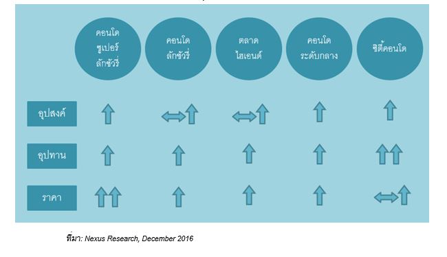 สำหรับแนวโน้มตลาดคอนโดมิเนียมในปี 2560 อุปทานคาดว่าจะเพิ่มขึ้นประมาณ 10% โดยส่วนใหญ่จะเป็นคอนโดมิเนียมในบริเวณรอบๆ กรุงเทพชั้นใน และกรุงเทพชั้นนอก ความต้องการห้องชุดจะเติบโตขึ้นในอัตราที่ใกล้เคียงกันกับอุปทาน โดยตลาดกรุงเทพชั้นนอก น่าจะมีโอกาสเติบโตได้ดี ทั้งนี้ ขึ้นอยู่กับปัจจัยต้นทุนในการพัฒนาโครงการซึ่งจะส่งผลต่อการตั้งราคาขายและความสามารถในการซื้อที่มีอยู่จำกัดของลูกค้ากลุ่มนี้ด้วย