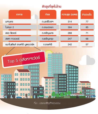 ส่วนอันดับ 3 โครงการ "เดอะ ริเวอร์" บน ถ.เจริญนคร พัฒนาโดย บมจ.ไรมอนแลนด์ ตึกเซาธ์ทาวเวอร์ สูง 268 เมตร จำนวน 71 ชั้น เป็นความสูงที่ชมวิวริมน้ำเจ้าพระยาได้แจ่มชัด อันดับ 4 เป็นของ "สเตท ทาวเวอร์" อาคารอายุ 15 ปี บน ถ.เจริญกรุง ความสูง 247 เมตร จำนวน 68 ชั้น ยังเด่นเป็นสง่าด้วยโดมสีทองด้านบน และอันดับ 5 เพิ่งเสร็จสมบูรณ์ในปีนี้ คือ "แมกโนเลียส์ ราชดำริ บูเลอวาร์ด" บน ถ.ราชดำริ พัฒนาโดยบริษัท แมกโนเลีย ไฟน์เนสท์ คอร์ปอเรชั่น จำกัด สูง 242 เมตร จำนวน 57 ชั้น