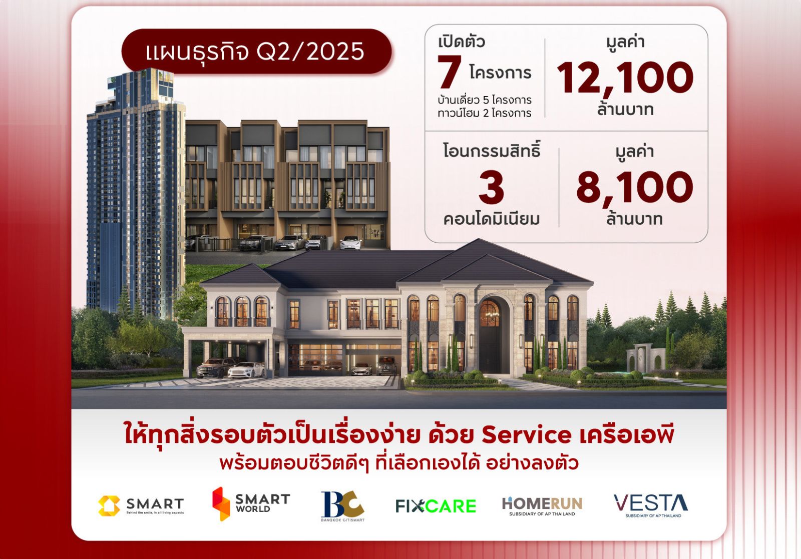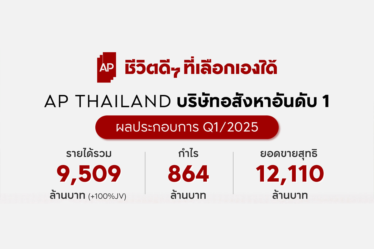 เอพี ไทยแลนด์ เผลผลการดำเนินงาน Q1/2568 คว้ารายได้รวม 9,509 ล้านบาท กำไรสุทธิ 864 ล้านบาท และยอดขายสุทธิ 12,110 ล้านบาท มีสัดส่วนหนี้สินสุทธิต่อทุนที่ต่ำเพียง 0.68 เท่า Q2 ลุยเปิดตัวแนวราบใหม่ 7 โครงการ มูลค่ารวม 12,100 ล้านบาท พร้อมเตรียมโอนกรรมสิทธิ์ 3 คอนโดพร้อมอยู่ มูลค่ารวม 8,100 ล้านบาท