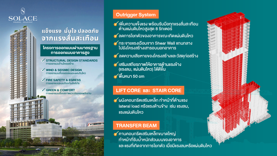 สำหรับจุดเด่นของโครงการ โซลเลซ พหลฯ-ประดิพัทธ์ คือคุณภาพของงานก่อสร้าง โดยโครงการใช้ระบบ Outrigger System เพิ่มความแข็งแรงพร้อมรับมือทุกแรงสั่นสะเทือนต้านแผ่นดินไหวสูงสุด 8 ริกเตอร์ ลดการโยกตัวของอาคารขณะเกิดแผ่นดินไหว กระจายแรงเฉือนจาก Shear Wall แกนกลางไปยังโครงสร้างเสารอบนอกอาคารลดความเสียหายของโครงสร้างและวัสดุก่อสร้าง ช่วยเสริมเสถียรภาพให้อาคารต้านแรงข้าง (แรงลม, แรงแผ่นดินไหว) ได้ดีขึ้น