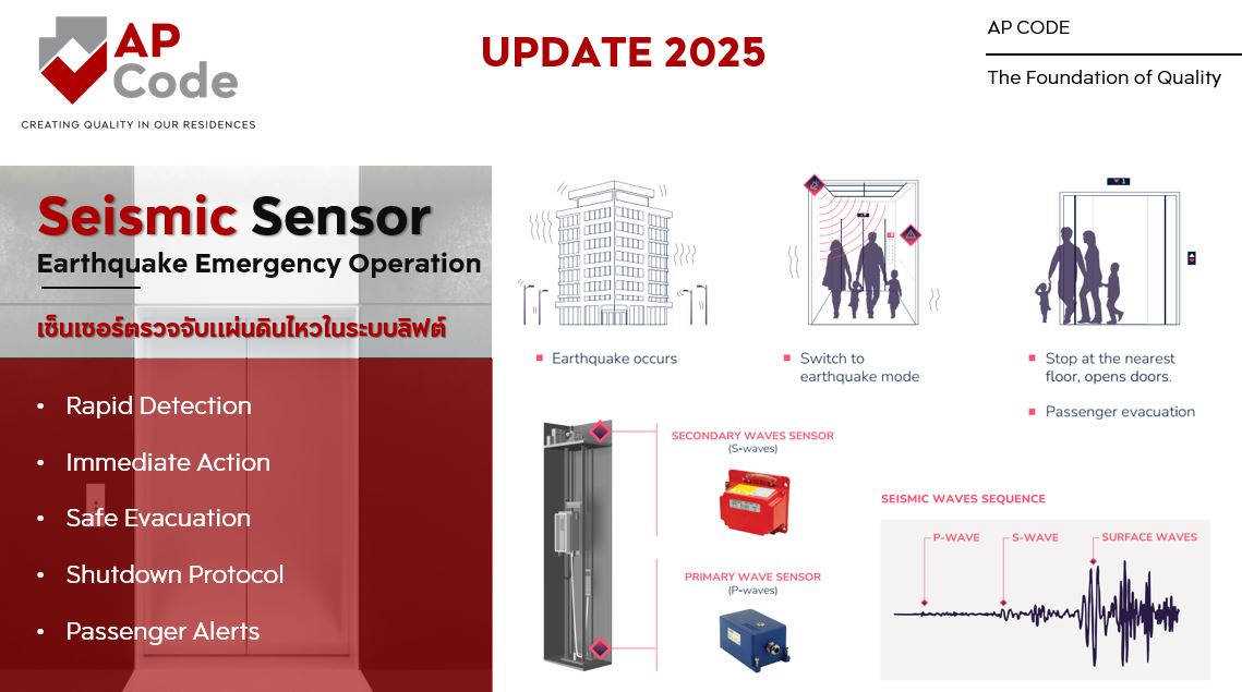 โดยโครงการ ASPIRE อ่อนนุช สเตชั่น จะเป็นโครงการนำร่องแรกที่จะติดตั้งระบบเซ็นเซอร์ตรวจจับแผ่นดินไหวในลิฟต์โดยสาร หรือเทคโนโลยี Seismic Sensor-Earthquake Emergency Operation in Elevator ซึ่งเป็นมาตรฐานที่เหนือกว่าคอนโดฯ ทั่วไปในตลาด ระบบนี้คือความตั้งใจในการป้องกันและลดผลกระทบจากเหตุการณ์ไม่คาดฝันให้ได้มากที่สุด ให้ทุกวินาทีที่อยู่ภายในโครงการ เป็นไปด้วยความสบายใจและปลอดภัยสูงสุด