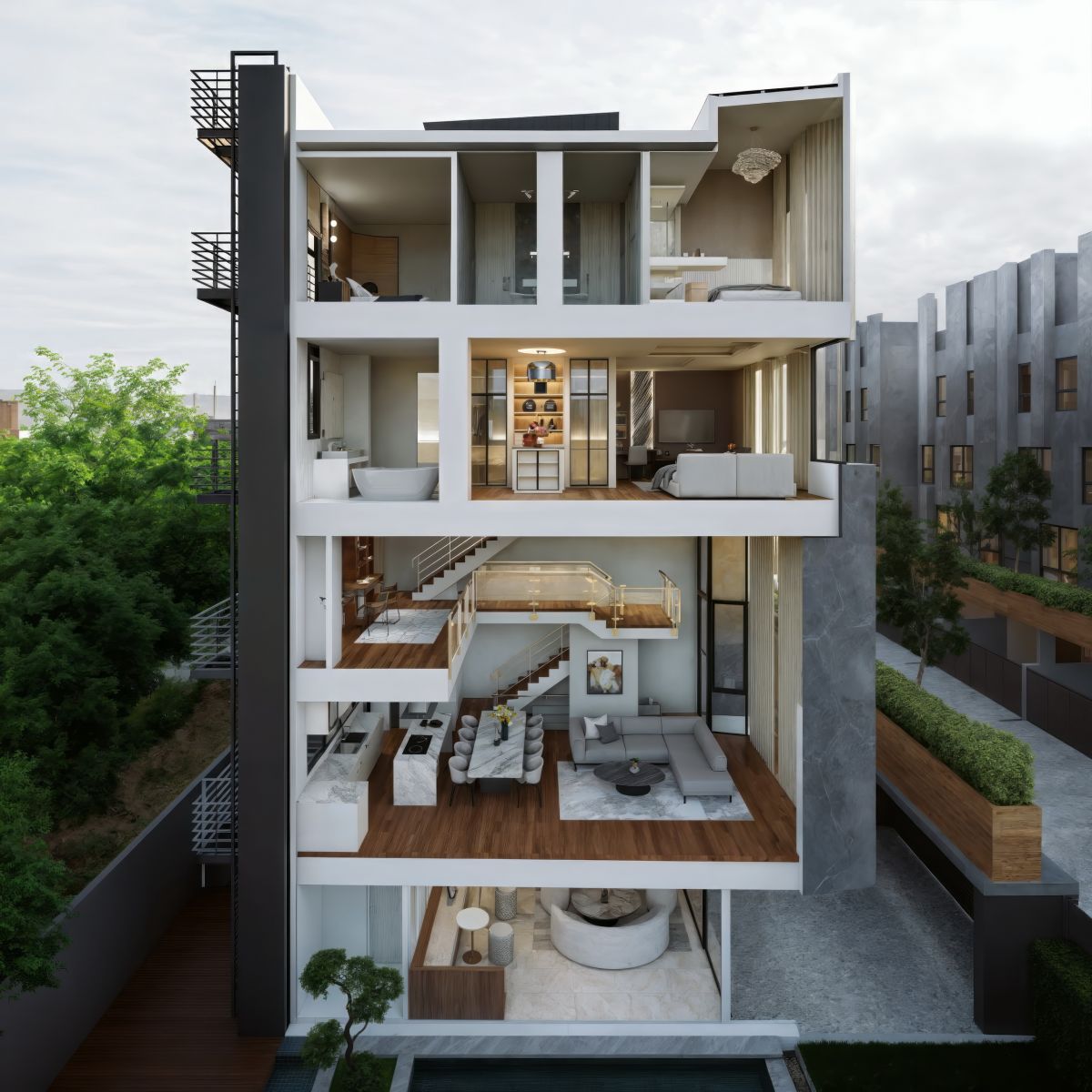 1. ทาวน์โฮม 4.5 ชั้น ขนาด 302 ตารางเมตร จำนวน 6 ยูนิต มาพร้อมกับ 3 ห้องนอน, 1 ห้องอเนกประสงค์ / 1 ห้องนอน, 5 ห้องน้ำ, 1 ห้องนั่งเล่น, 1 ห้องรับประทานอาหาร, 1 ห้องครัว และ 3 ที่จอดรถ