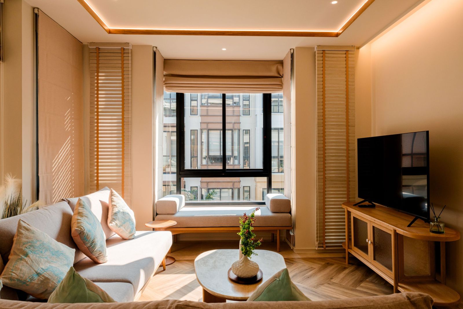 นอกจากนี้ยังมีมุมเบย์วินโดว์ริมหน้าต่างให้ได้นั่งเพลิดเพลินไปกับการชมสวนจากส่วนกลางได้อย่างเต็มที่ อีกทั้งยังสามารถเดินออกจากระเบียงห้องไปยังส่วนกลาง และสระว่ายน้ำได้เลย ถือว่าเป็นห้องที่ตอบโจทย์และครบครันมาก สำหรับวันพักผ่อนจริง ๆ