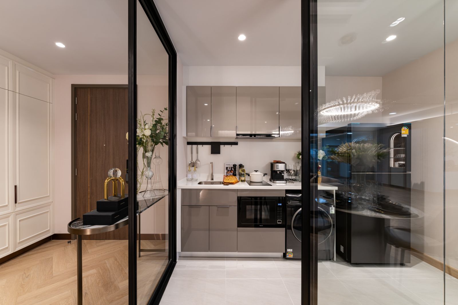 อีกทั้งยังติดตั้งสิ่งอำนวยความสะดวกภายในระดับพรีเมียมที่ตอบโจทย์การอยู่อาศัยอย่างครบครัน ไม่ว่าจะเป็นระบบ Digital Door Lock ชุดครัว Built-in พร้อม Hob & Hood และ Built-in Microwave เครื่องปรับอากาศแบบ Cassette Type ที่มาพร้อมระบบกรองฝุ่นละเอียด PM1.0 รวมถึงห้องน้ำที่ตกแต่งด้วยโถสุขภัณฑ์อัตโนมัติแบบ Full Function ฝักบัว Hand Shower และ Rain Shower พร้อมฉากกั้นอาบน้ำกระจกนิรภัย (Tempered Glass)