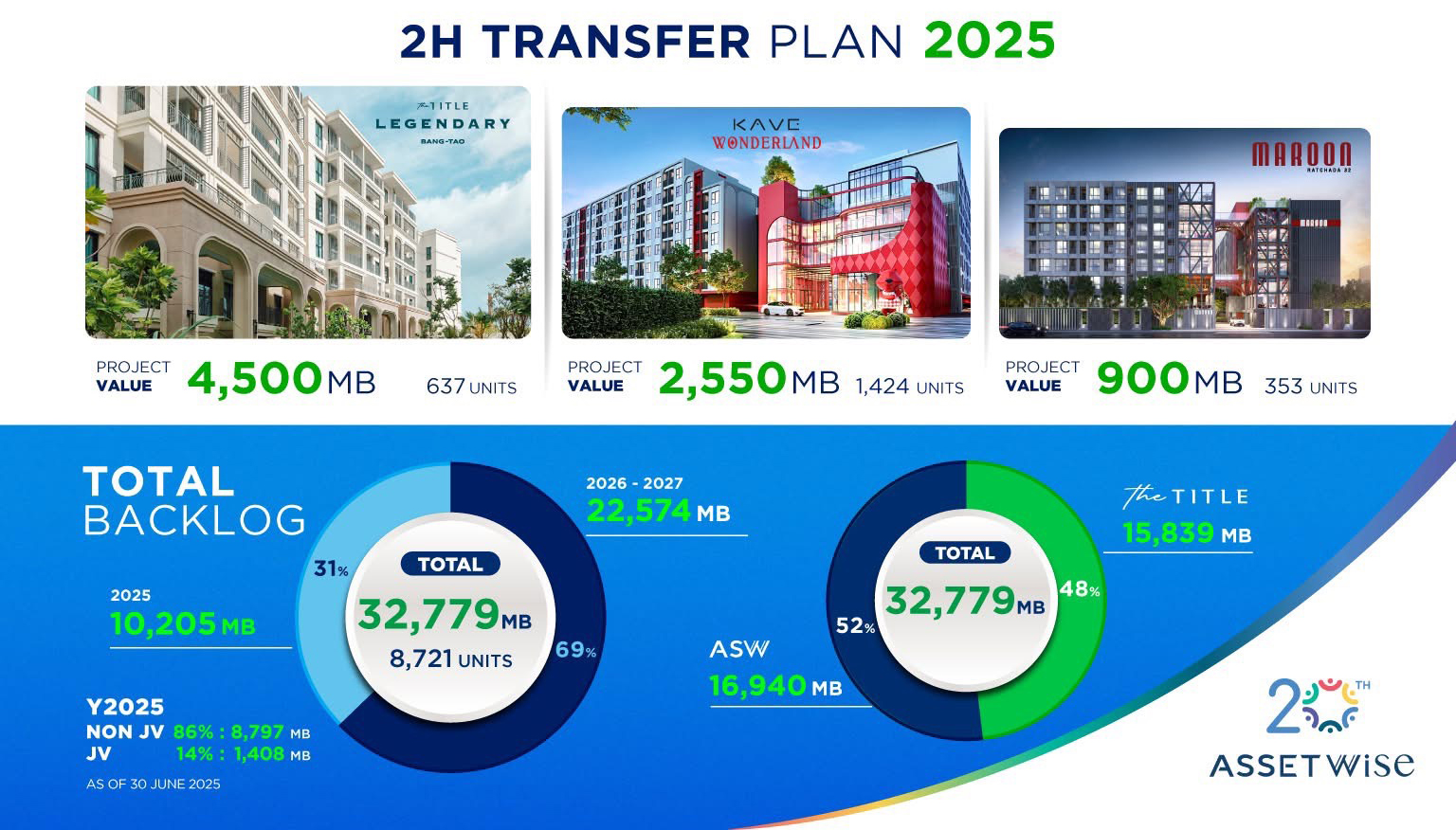 ASW ยังคงมุ่งรักษาสภาพคล่องทางการเงินและกระแสเงินสด (Cash Flow) ให้แข็งแกร่ง โดยเร่งโอนกรรมสิทธิ์โครงการที่อยู่อาศัยให้ได้ตามแผนงาน ทั้งโครงการสร้างเสร็จใหม่ในครึ่งปีแรกที่ยังคงทยอยโอนต่อเนื่อง และโครงการสร้างเสร็จใหม่ที่เตรียมรับรู้รายได้ในครึ่งปีหลังอีกจำนวน 3 โครงการ ได้แก่
