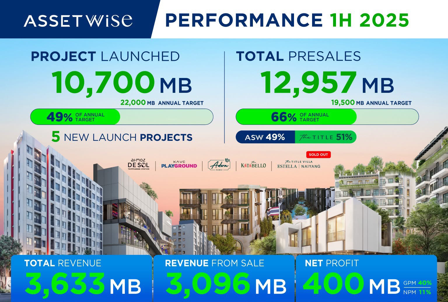 นายกรมเชษฐ์ วิพันธ์พงษ์ ประธานเจ้าหน้าที่บริหาร บริษัท แอสเซทไวส์ จำกัด (มหาชน) หรือ ASW บริษัทพัฒนาอสังหาริมทรัพย์ที่เป็นผู้นำด้านไลฟ์สไตล์ภายใต้แนวคิด “ความสุขที่ออกแบบมาเพื่อคุณ” หรือ “We Build Happiness” เปิดเผยว่า ในช่วงไตรมาส 2/2568 (เมษายน-มิถุนายน 2568) บริษัททำรายได้รวม 1,829 ล้านบาท ส่งผลให้ ASW มีรายได้รวม 6 เดือนแรกของปี 2568 ทั้งสิ้น 3,633 ล้านบาท โดยมีกำไรสุทธิสะสม 400 ล้านบาท