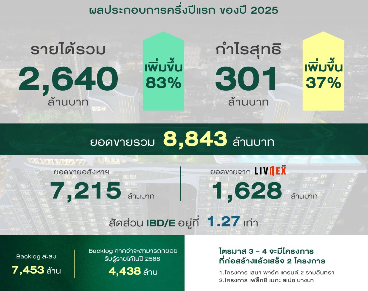 บริษัทมียอดขายจากธุรกิจอสังหาฯ จำนวนรวมทั้งสิ้น 8,843 ล้านบาท เป็นยอดขายอสังหาฯ เพื่อขาย จำนวน 7,215 ล้านบาท ยอดขายจาก LivNex (เช่าออมบ้าน) จำนวน 1,628 ล้านบาท และมียอดรายได้รวมทั้งสิ้น 2,640 ล้านบาท กำไรขั้นต้น 823 ล้านบาท คิดเป็น 33% ของรายได้รวม ซึ่งเพิ่มขึ้น 76% จากช่วงเดียวกันของปีก่อนหน้า และมีกำไรสุทธิ 301 ล้านบาท คิดเป็น 11% ของรายได้รวม เพิ่มขึ้น 37% จากช่วงเดียวกันของปีก่อนหน้า