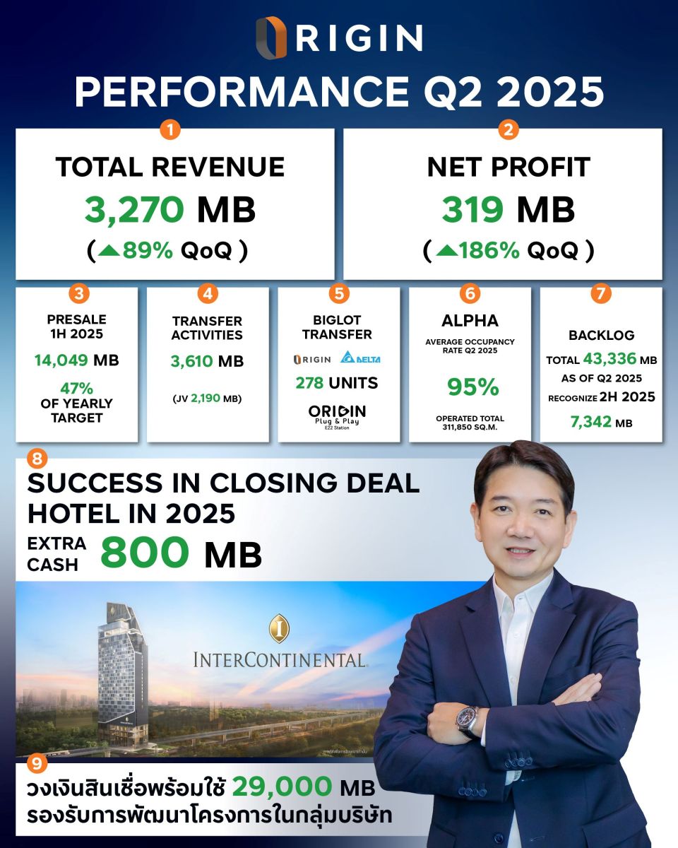 ออริจิ้น เผยผลประกอบการไตรมาส 2 ปี 2568 กวาดรายได้รวม 3,610 ล้านบาท กำไร 319 ล้านบาท เพิ่มขึ้นกว่า 3 เท่า (QoQ) ขณะที่ยอดขายบ้าน-คอนโด สะสม 6 เดือนแรกรวมอยู่ที่ 14,049 ล้านบาท คิดเป็น 47% ของเป้าทั้งปี พร้อมโชว์ Backlog ในมือกว่า 43,336 ล้านบาท สร้างรายได้ต่อเนื่อง 5 ปี Q3/2568 จ่อโอนคอนโดอีก 4 โครงการ แบ็คล็อคกว่า 4,000 ล้านบาท