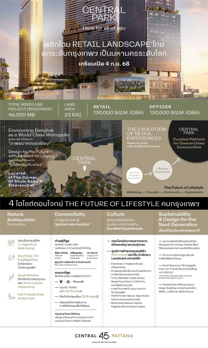 เพื่อปั้นแลนด์มาร์กใหม่ใจกลางกรุงเทพฯ พลิกโฉมธุรกิจรีเทลด้วยแรงบันดาลใจจากภาพอนาคตของเมือง พร้อมเผยกลยุทธ์การสร้าง “ศูนย์การค้าแห่งอนาคต” รองรับไลฟ์สไตล์ใหม่ของคนเมืองครบทุกมิติที่สุด และยกระดับกรุงเทพฯ สู่มหานครระดับโลก เปิดเฟสแรก 4 ก.ย. 68 ภายใต้คอนเซปต์ ‘Here for all of you’ โดยแบรนด์ เซ็นทรัล พาร์ค ประกอบด้วย ศูนย์การค้า และอาคารสำนักงาน รับชมวิดีโอเซ็นทรัล พาร์ค คลิก: https://youtu.be/ZtPy9k4clqE
