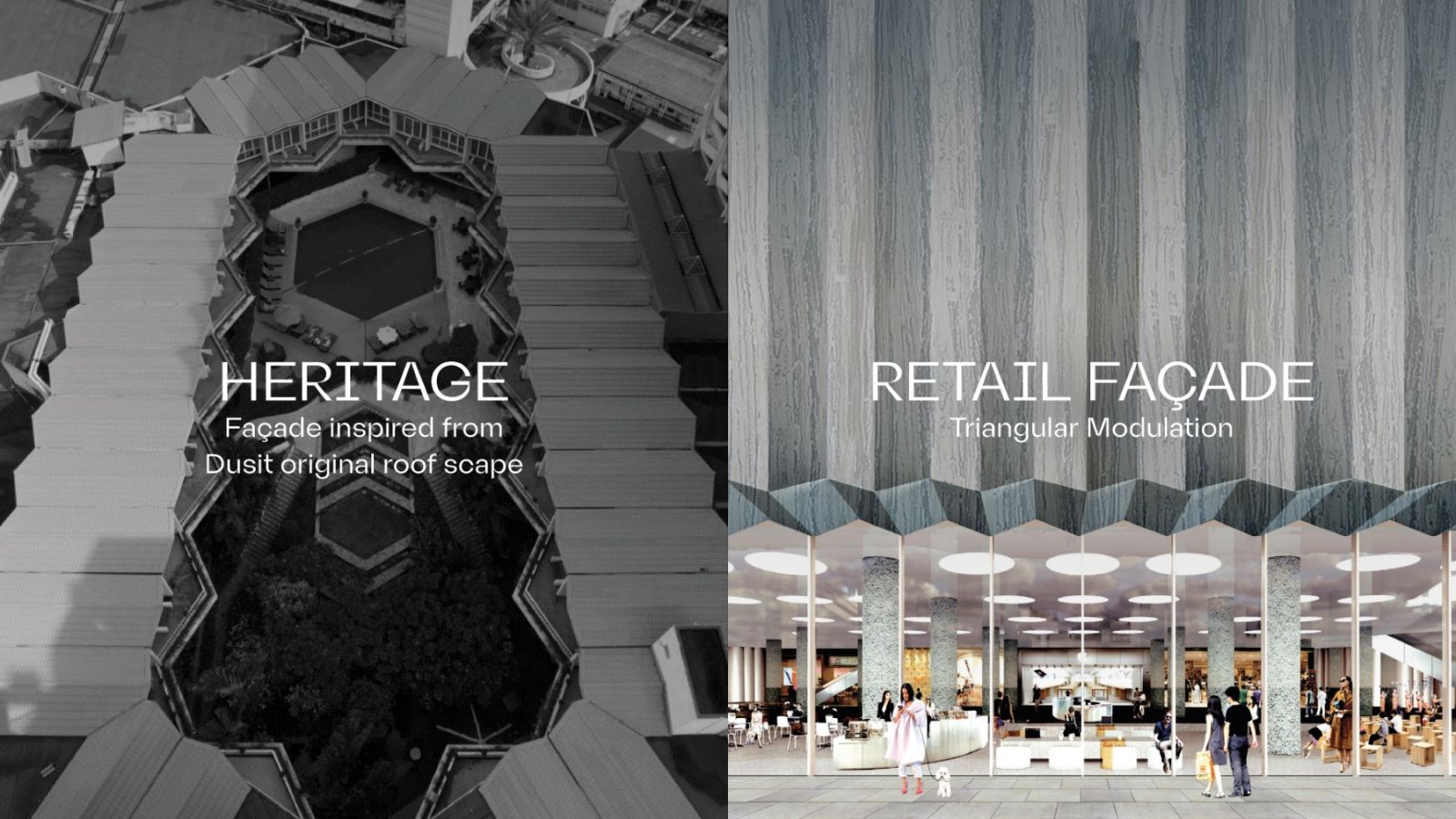 ด้านงานดีไซน์ ยังคง Legacy ของดุสิต โดยได้นำ Podium มาพัฒนาเป็น Façade ที่สะท้อน Heritage ผ่านทุกดีเทล ใช้โทนสี “3 กษัตริย์” - เงิน ทอง และคอปเปอร์ - แทนความหมายของโรงแรม ออฟฟิศ และเรสซิเดนซ์ Façade โค้งและคลื่น เพิ่มมิติด้วย Void พร้อมจอ LED digital curved ขนาดใหญ่กว่า 518 ตร.ม. รองรับคอนเทนต์ 3D ด้วย Visual Impact ที่ดึงดูดสายตากว่า 8 ล้านคู่ต่อวัน กลายเป็นจุด Landmark ใหม่ที่พร้อมต้อนรับนักท่องเที่ยวจากทั่วโลก