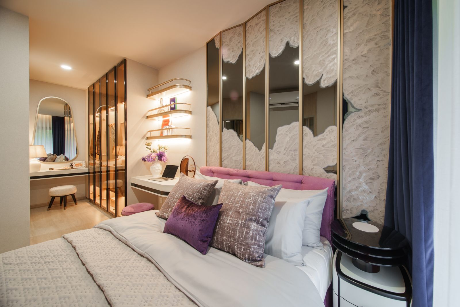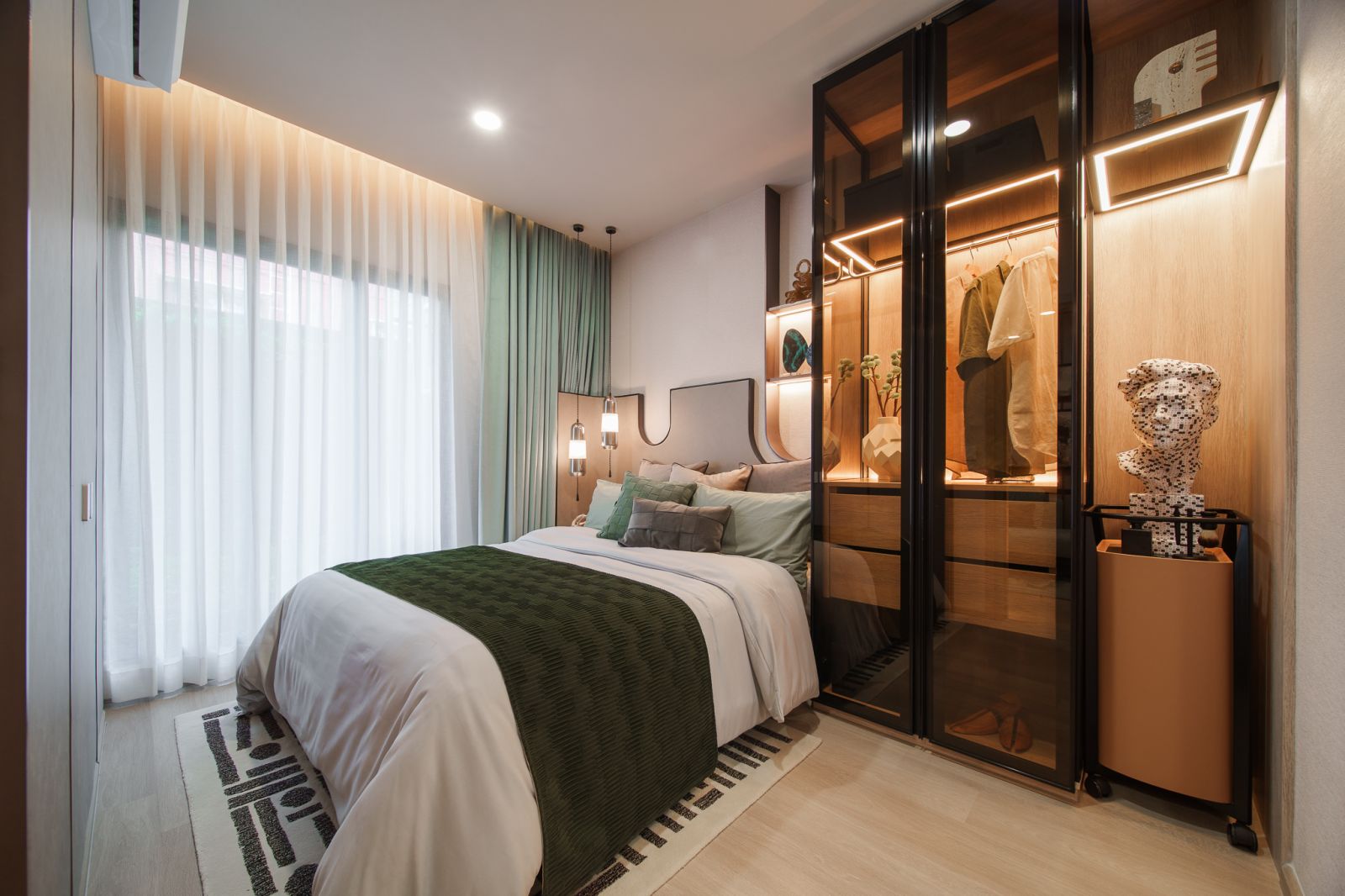 ในขณะที่ห้อง Master Bedroom พร้อม Walk-in Closet และยังคงความเป็นส่วนตัวสูงสุด พร้อมการจัดวางห้องน้ำที่สามารถเข้าถึงได้จากทั้งส่วน Living และ Master Bedroom การออกแบบที่คำนึงถึงความสะดวกสบายและการเชื่อมต่อในการใช้งาน พื้นที่ครัวแบบปิดเป็นสัดส่วน