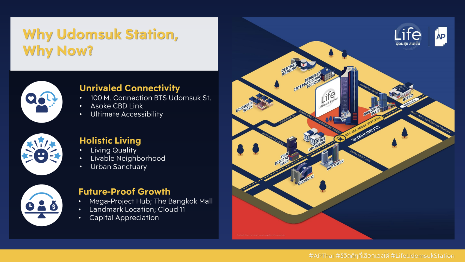 “ทำเลอุดมสุข ที่ไม่พบการพัฒนาคอนโดใหม่บนถนนสุขุมวิท และใกล้รถไฟฟ้ามานานเกือบ 10 ปี และวันนี้ เอพี ไทยแลนด์ และ มิตซูบิชิ เอสเตท พร้อมแล้วที่จะเปิดตัว LIFE อุดมสุข สเตชั่น โปรเจกต์ที่ได้รับการออกแบบอย่างพิถีพิถัน ที่จะพลิกโฉมย่านนี้