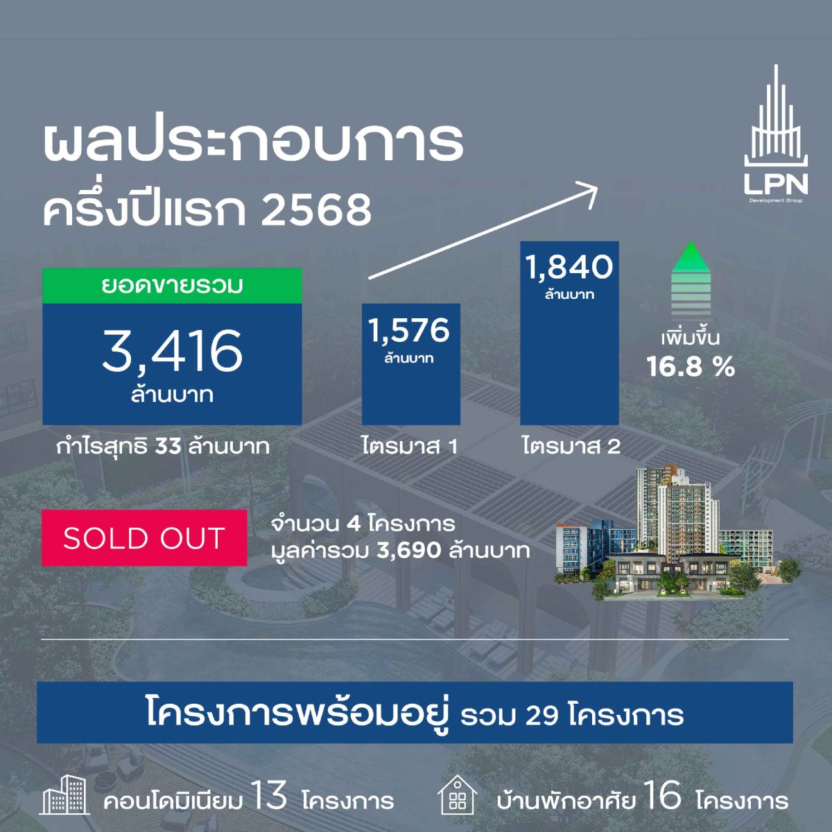 LPN เผยผลประกอบการครึ่งปีแรก 2568 มีรายได้รวม 3,053 ล้านบาท กำไรสุทธิ 33 ล้านบาท โดยมาจากธุรกิจพัฒนาอสังหาริมทรัพย์ และธุรกิจบริการด้านอสังหาริมทรัพย์อื่นๆ โดยมียอดขายรวมในครึ่งปีแรกอยู่ที่ 3,416 ล้านบาท แบ่งเป็นยอดขายจากโครงการคอนโดมิเนียม 72% และโครงการบ้านพักอาศัย 28%
