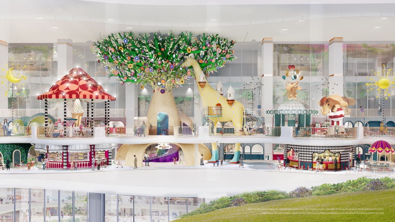 - Whimsical Market แลนด์มาร์กแฟนตาซีแห่งความสุข โดดเด่นด้วยต้นไม้ความสูงเท่าตึก 3 ชั้น เต็มไปด้วยแสง สี เสียง และประติมากรรมที่เคลื่อนไหวราวกับมีชีวิต ให้ความรู้สึกเหมือนอยู่ในธีมพาร์ค