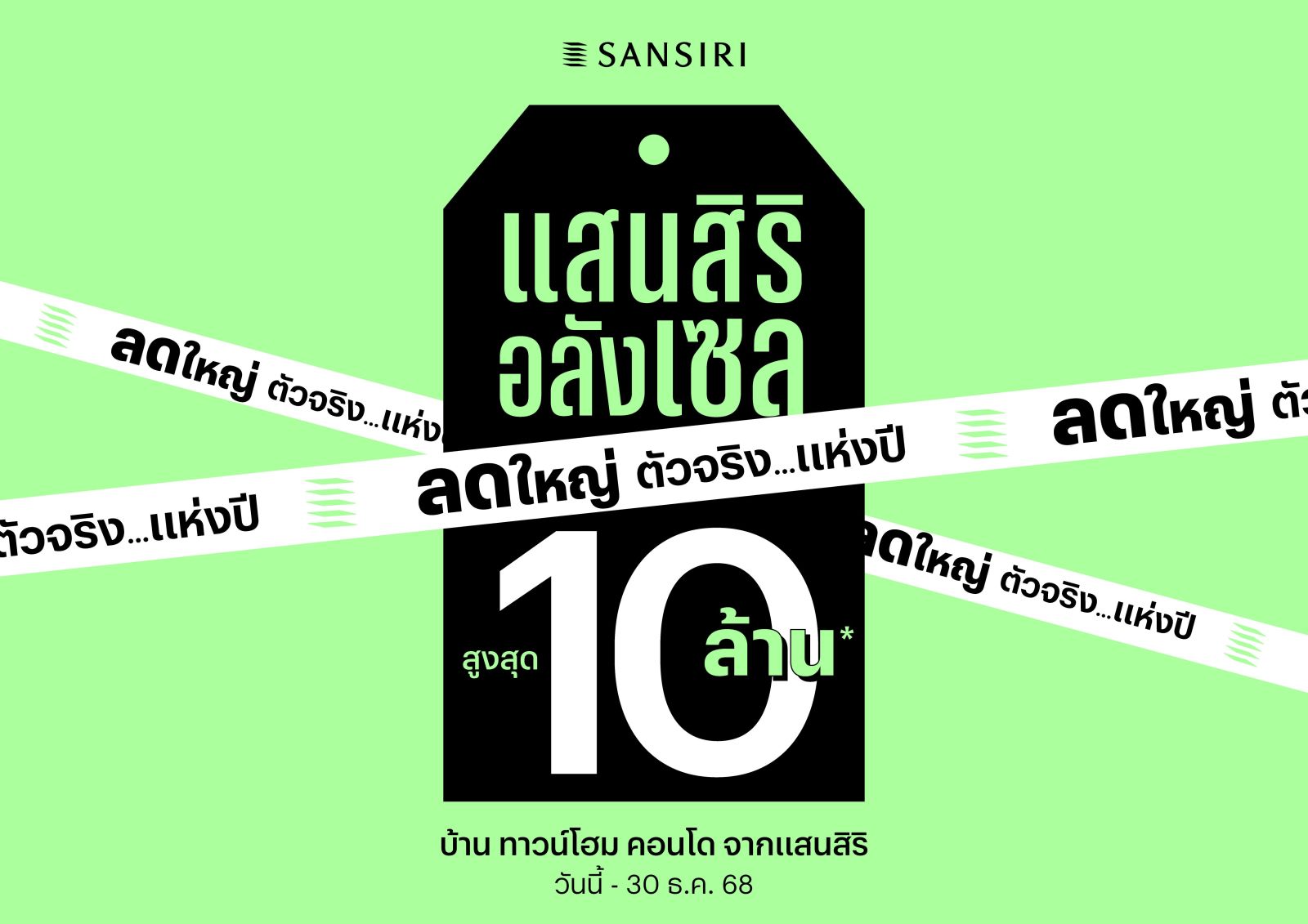 เพื่อตอบรับเสียงเรียกร้องจากลูกค้า แสนสิริ เดินหน้ามอบดีลใหญ่สุดพิเศษ ต่อเนื่องทันที กับ “แสนสิริ อลังเซล” ลดใหญ่ ตัวจริง…แห่งปี ลดสูงสุด 10 ล้านบาท* กับบ้าน คอนโด และทาวน์โฮม รวมกว่า 109 โครงการ ราคาพิเศษทุกยูนิต เริ่มต้น 8.9 แสน-29.9 ล้านบาท พร้อมอัตราดอกเบี้ยจากธนาคารพันธมิตรชั้นนำ ผ่อนต่ำเริ่มต้นล้านละ 2,500 บาท* และโปรโมชันอื่น ๆ อีกมากมาย เริ่มตั้งแต่ 3 พฤศจิกายน-30 ธันวาคม 2568 ให้ทุกคนได้มีบ้านใหม่ต้อนรับปีใหม่ ด้วยข้อเสนอแห่งปี