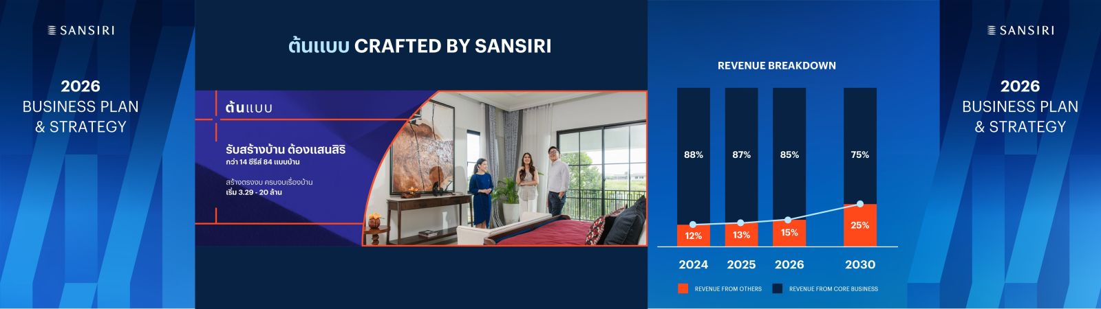 3. ปั้น New S-Curve เร่งขยายฐานรายได้ใหม่ผ่านธุรกิจที่หลากหลาย เพื่อเสริมเสถียรภาพทางการเงินในระยะยาว อาทิ ต้นแบบCrafted by Sansiri ธุรกิจรับสร้างบ้านที่เติบโตอย่างก้าวกระโดด โดยปีนี้ตั้งเป้ายอดขายเพิ่มขึ้น 100% (แตะระดับ 500 ล้านบาท) พร้อมจัดตั้งกองทุนมูลค่า 1,000 ล้านบาท เพื่อเข้าลงทุนในธุรกิจศักยภาพสูงอื่น ๆ โดยมีเป้าหมายเพิ่มสัดส่วนรายได้จากกลุ่มธุรกิจใหม่จาก 15% เป็น 25% ภายใน 5 ปี
