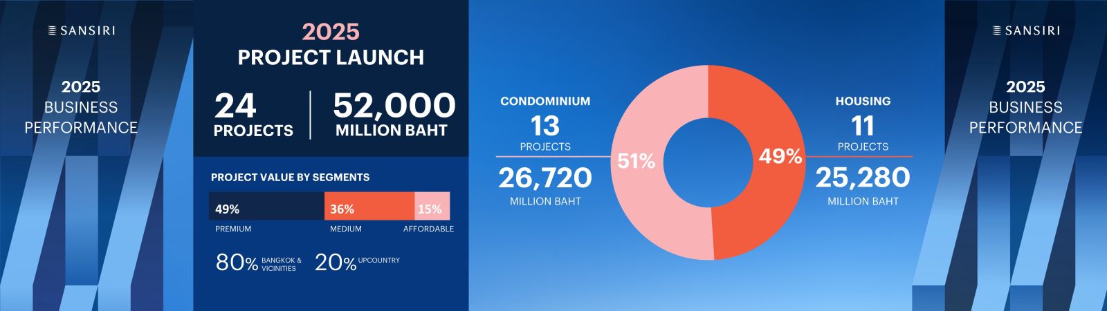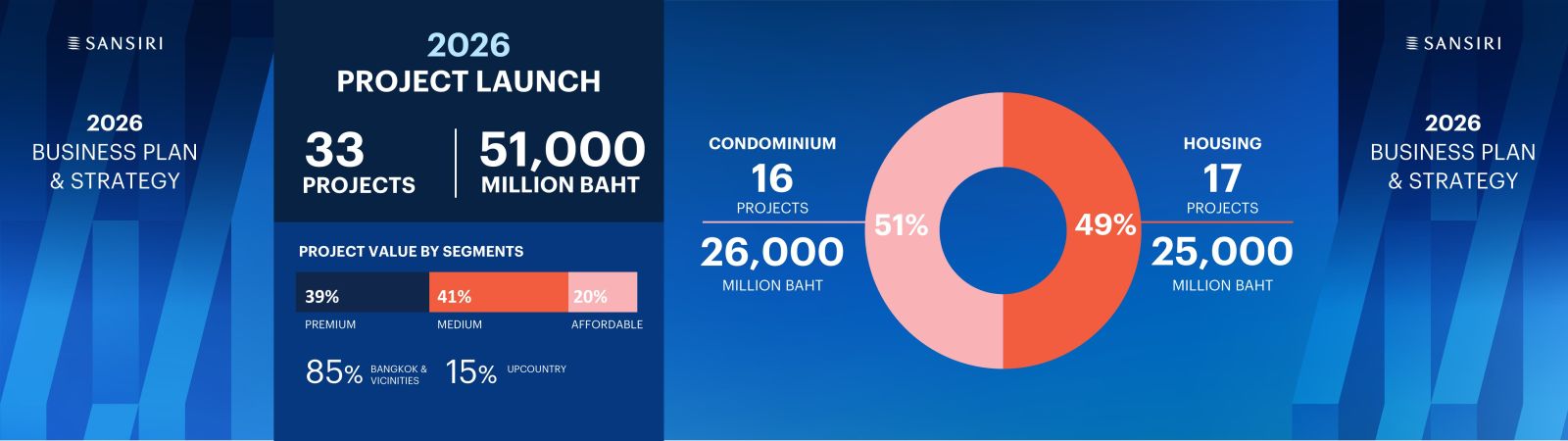 พร้อมประกาศแผนธุรกิจปี 2569 มุ่งเน้นการเติบโตของรายได้และกำไรอย่างมั่นคง ตั้งเป้ายอดขาย 48,000 ล้านบาท และยอดโอน 39,000 ล้านบาท ผ่านการเปิดตัว 33 โครงการใหม่ มูลค่ารวม 51,000 ล้านบาท โดยเน้นสัดส่วนกลุ่ม Premium และ Medium ถึง 80% เพื่อเจาะกลุ่มกำลังซื้อคุณภาพ (โครงการที่จะเปิดขายในปีนี้มีที่ดินครบหมดแล้ว)